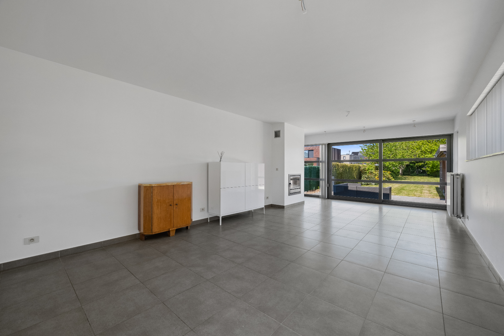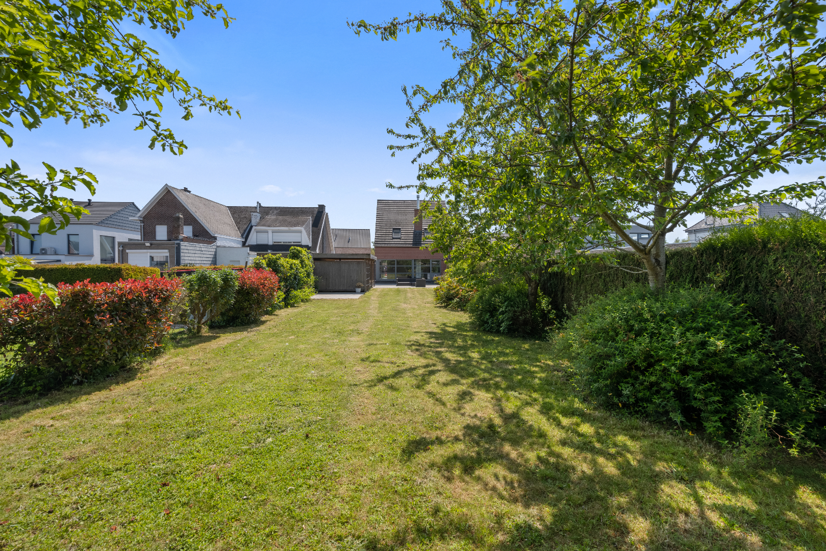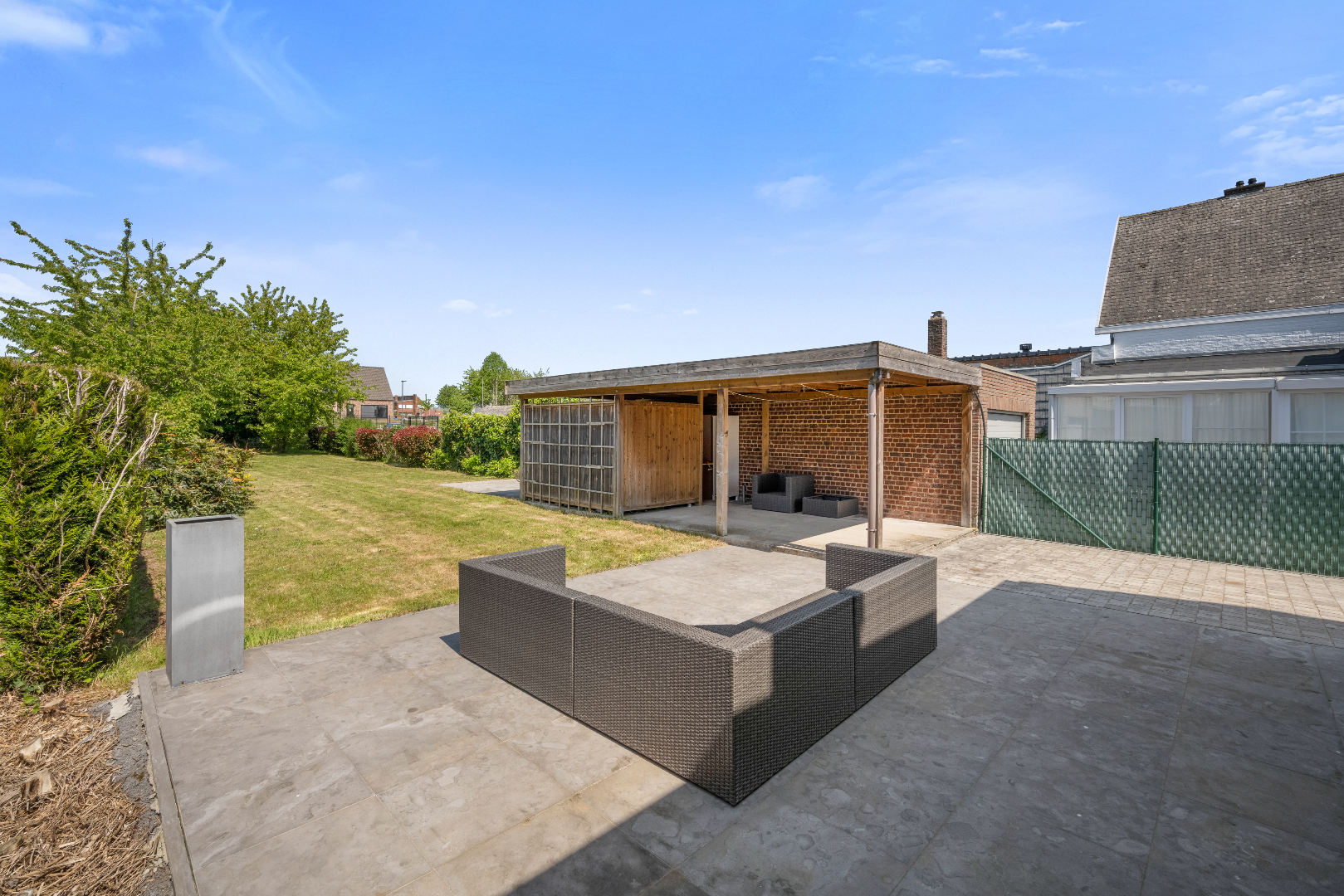 Grote raampartijen brengen ons naar het terras en de grote afgesloten tuin. Er is een carport en een tuinhuis.