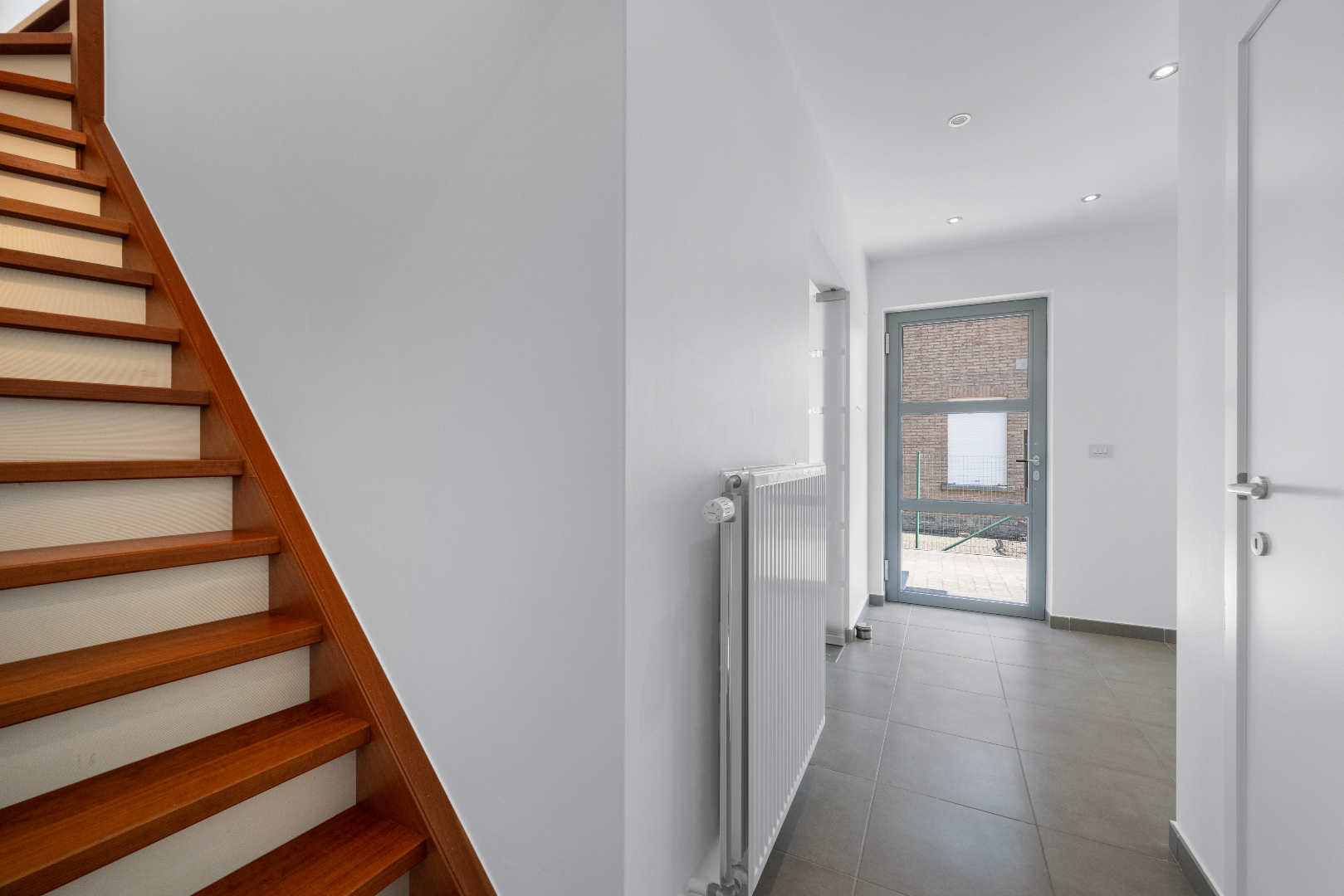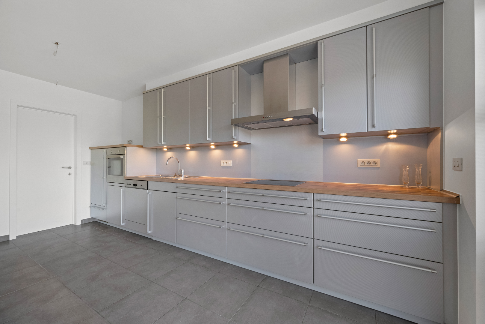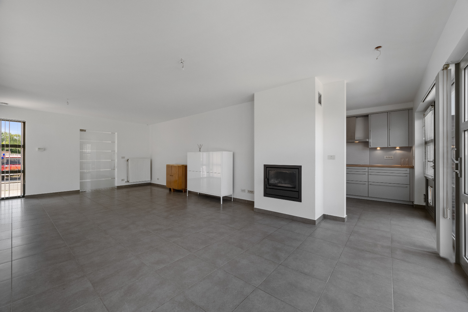 Via de ruime inkomhal met apart gastentoilet komen we in de zeer ruime, lichtrijke leefruimte die overloopt in de volledig ingericht ruime keuken.