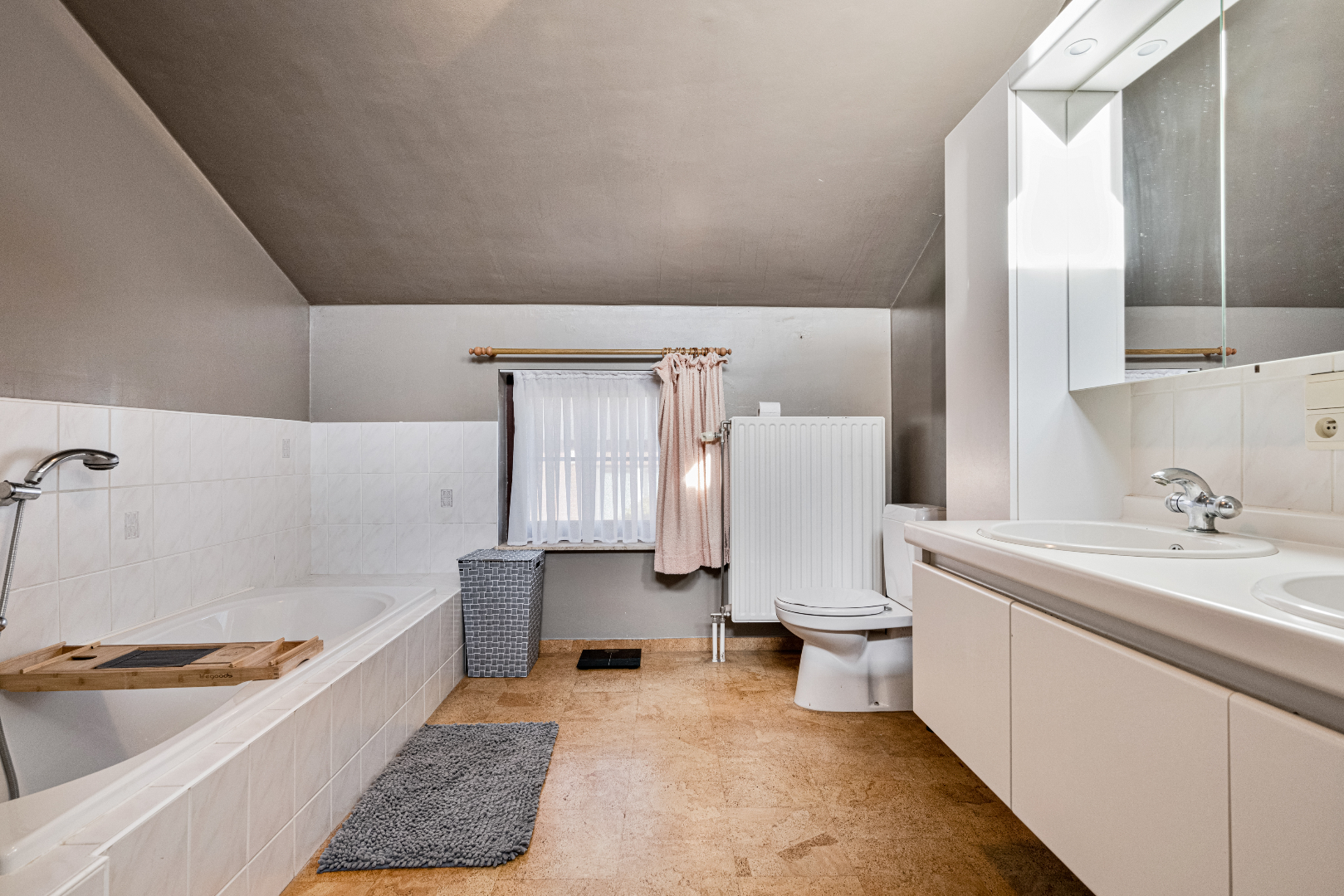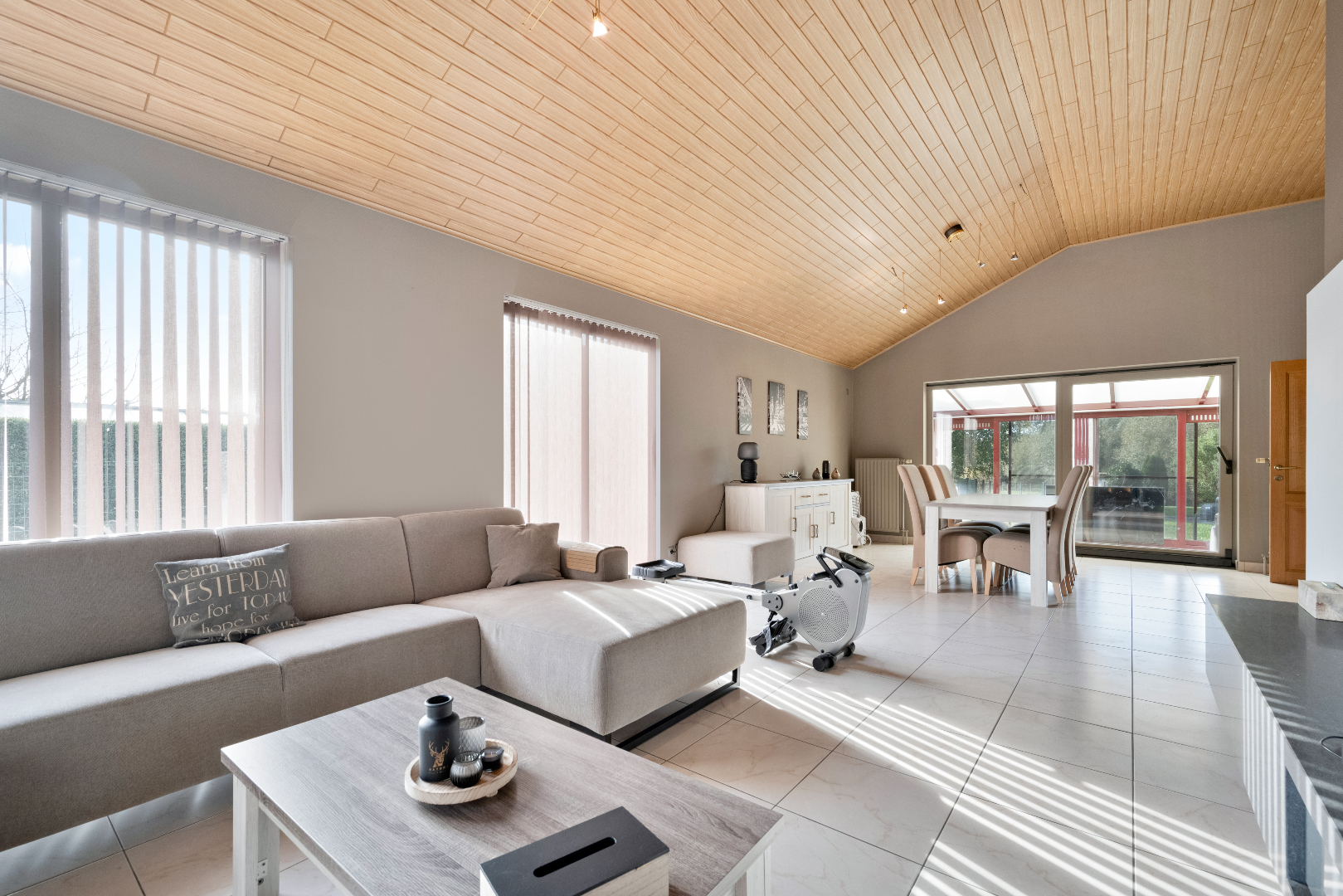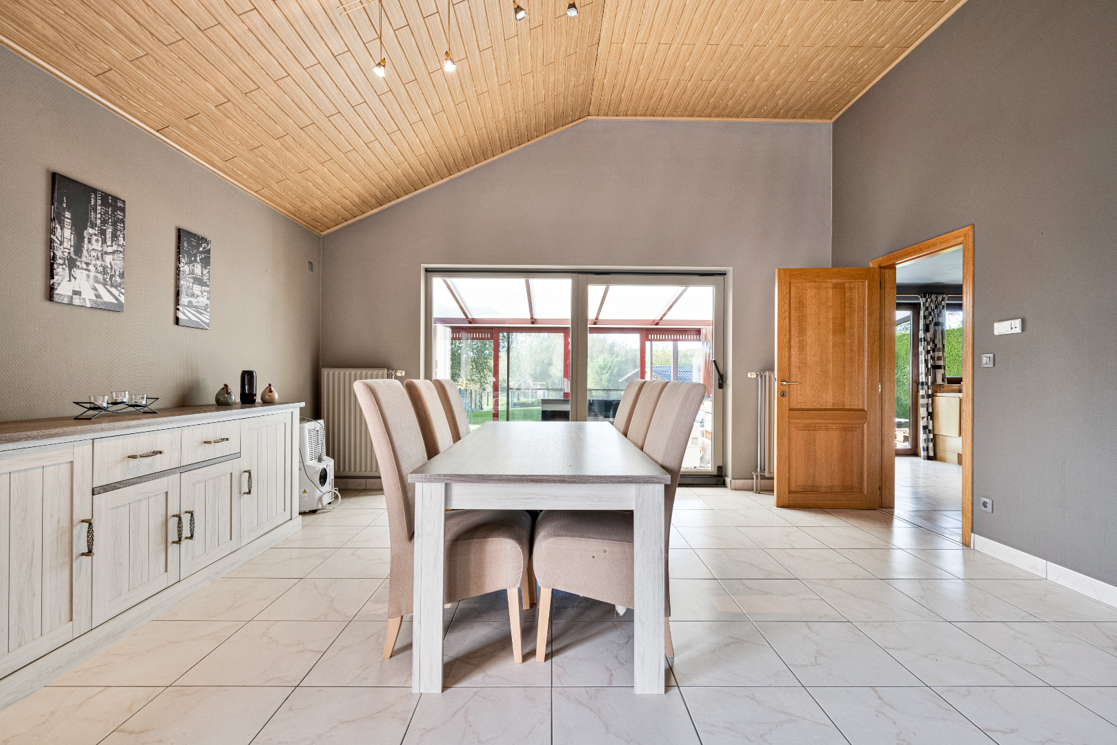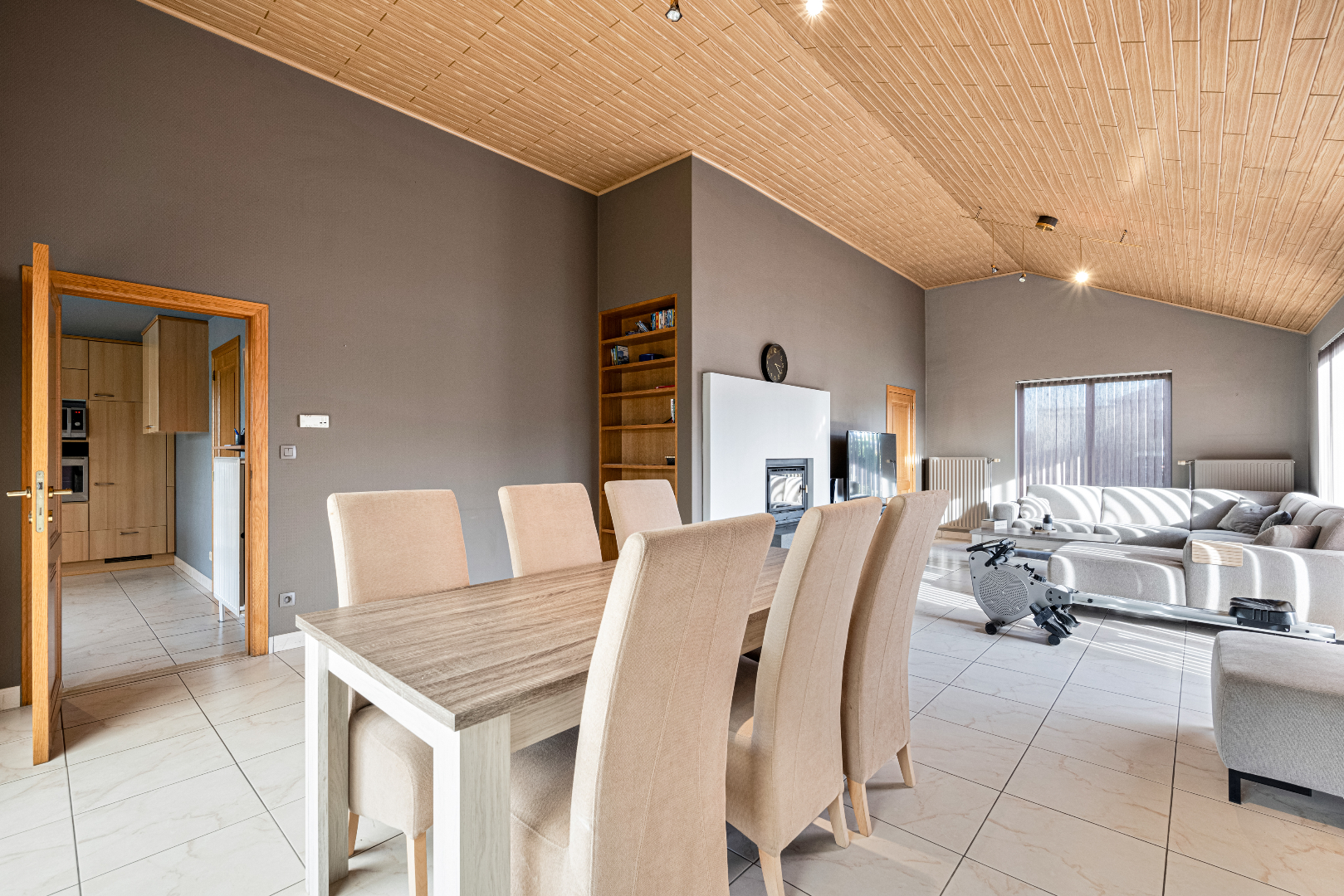 Via de ruime inkomhal met open trap, kom je in de leefruimte met cosy zithoek en eetkamer. Daarnaast bevindt zich de zeer ruime keuken, voorzien van alle comfort. Via de wasplaats kom je de garage met veel extra bergruimte. De veranda maakt deel uit van de leefruimte en daarnaast is er ook nog een prachtige pergola. De 3 slaapkamers en de badkamer bevinden zich op de eerste verdieping.