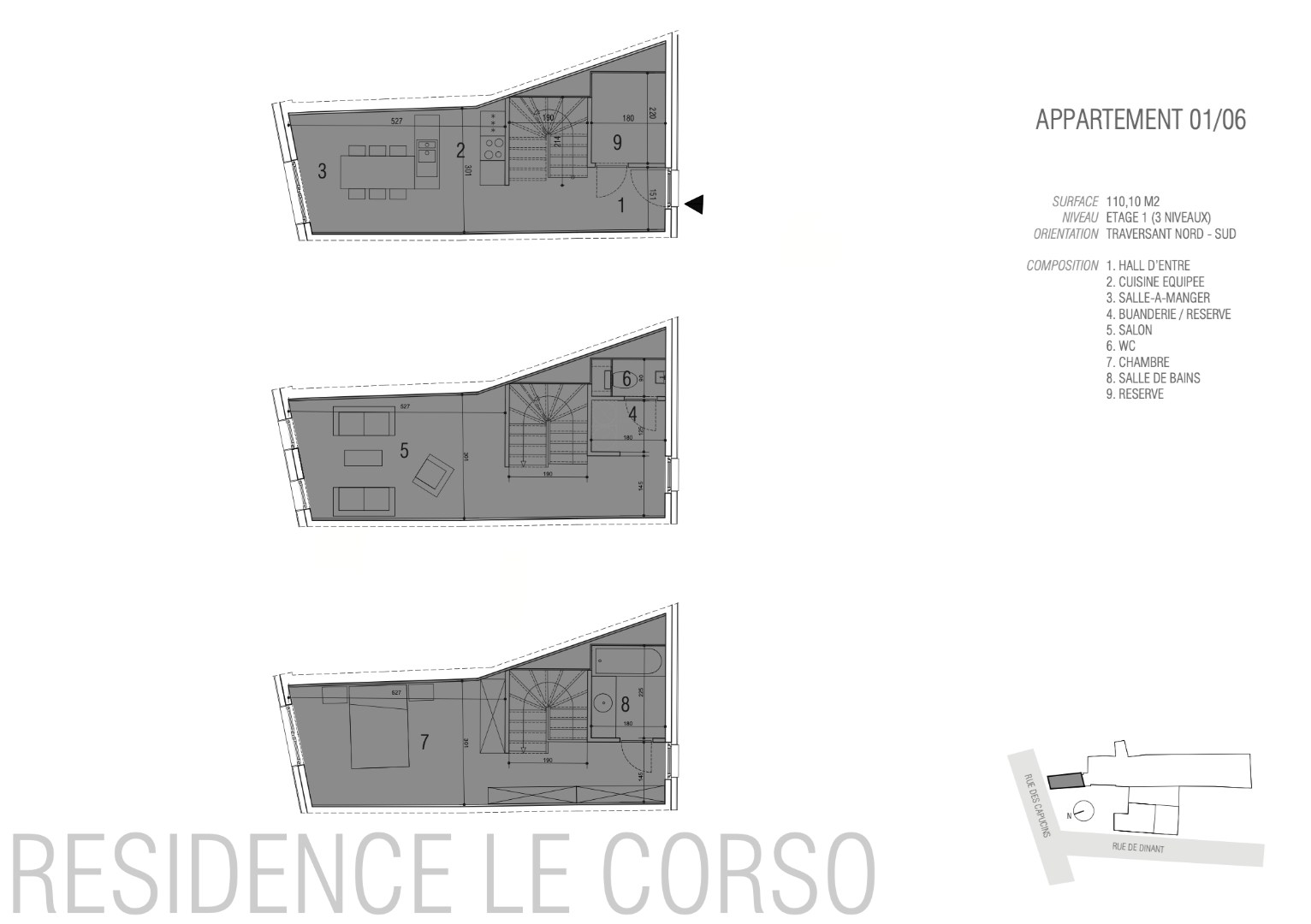Het appartement 1.06 bestaat uit 3 niveaus die zeer handig zijn ingedeeld: inkomhal, volledig uitgeruste keuken, eetkamer, salon, apart toilet, 1 slaapkamer, badkamer, voorraadkamer en berging. De totale bewoonbare oppervlakte bedraagt maar liefst 110,10 m2.