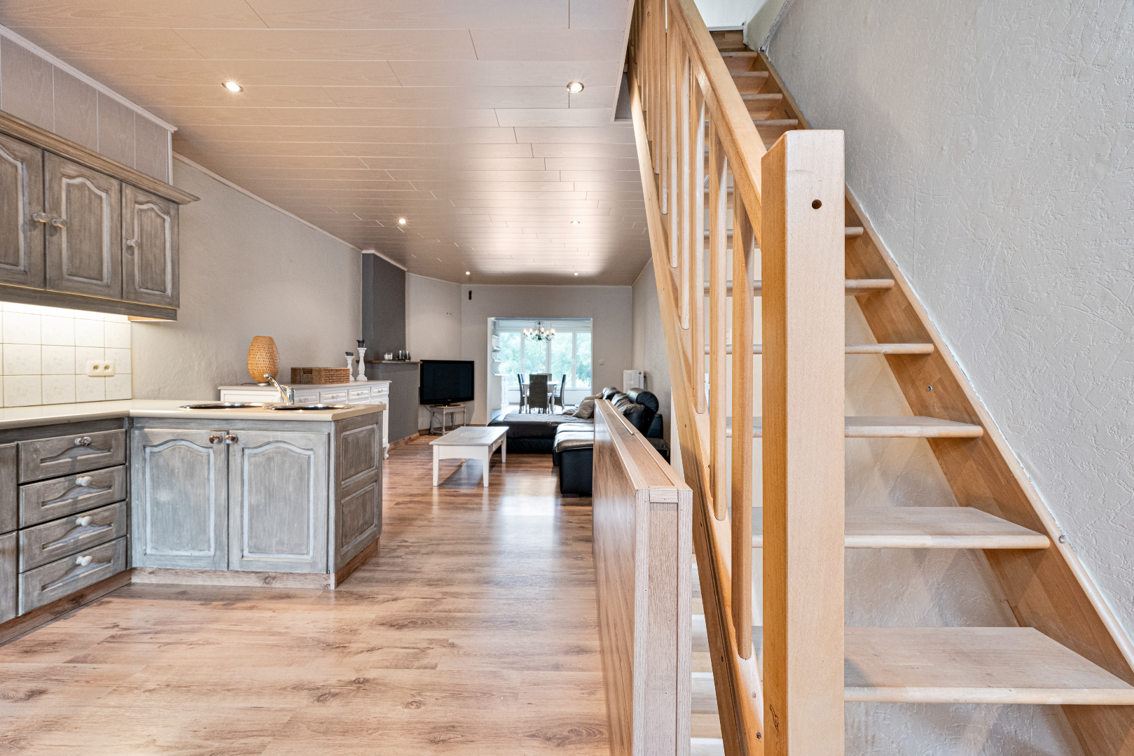 Daar bevinden zich de zit-en eethoek met open geïnstalleerde keuken. De masterbedroom en een ruime, moderne badkamer bekleden de 2de verdieping.