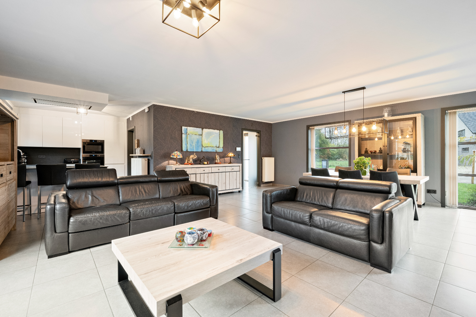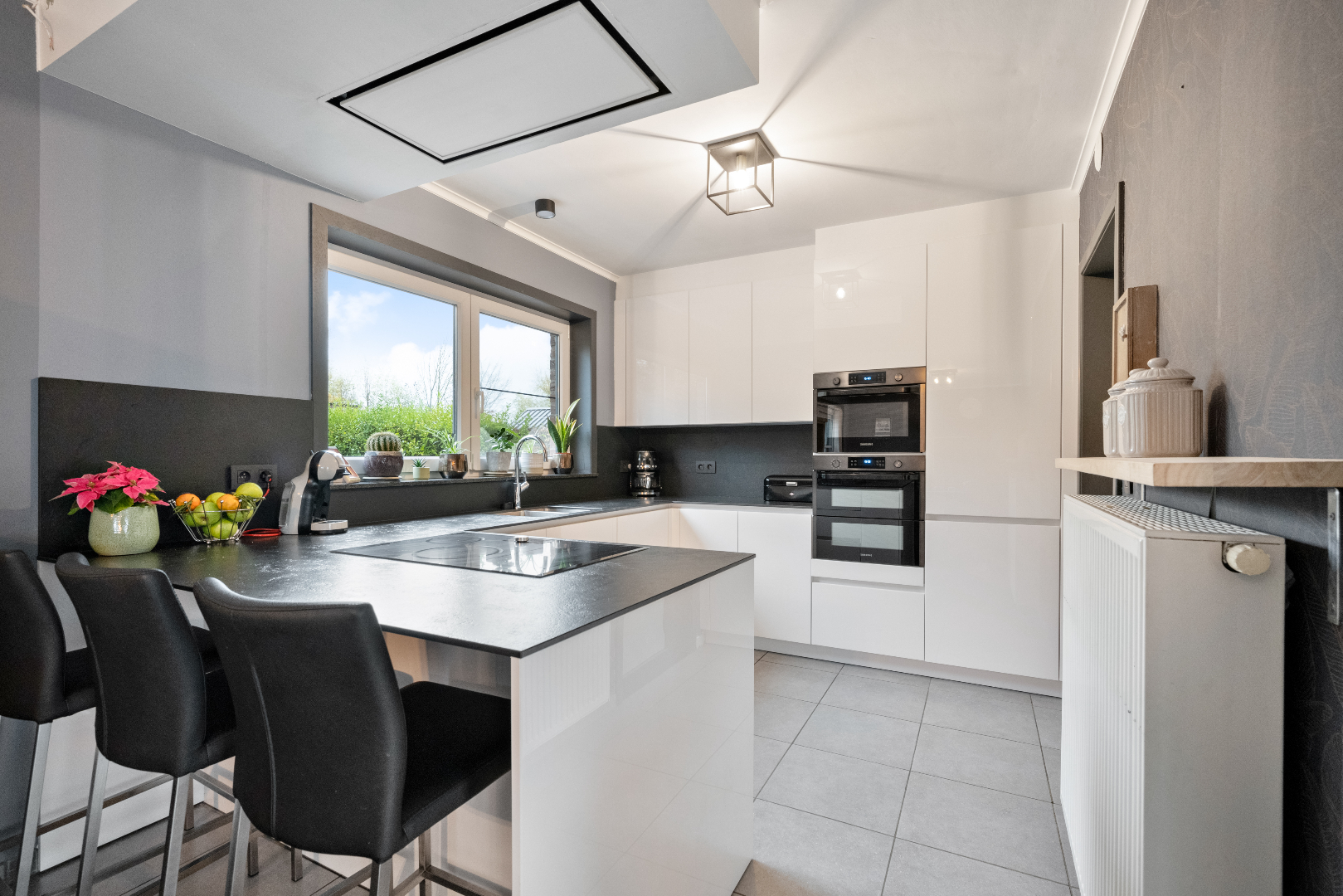 Via de inkomhal met open trap en gastentoilet, kom je in de zeer ruime en lichtrijke leefruimte met cosy zithoek en eetkamer. Aansluitend bevindt zich de nieuwe moderne keuken, voorzien van alle comfort. Naast de keuken bevindt zich de praktisch ingerichte berging met extra buitendeur. Op de verdieping vinden we een totaal vernieuwde badkamer met douche én ligbad en de 3 slaapkamers, waarvan de masterbedroom een aparte dressing heeft. De ruime garage van 50 m2 is zeer praktisch en biedt een absolute meerwaarde. De tuin is verzorgd en onderhoudsvriendelijk aangelegd en op de terrassen is het gezellig vertoeven.