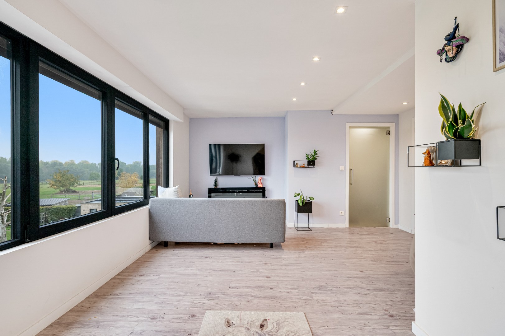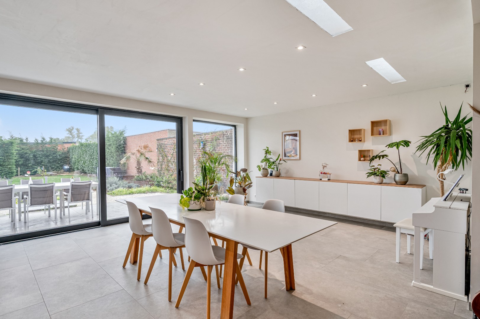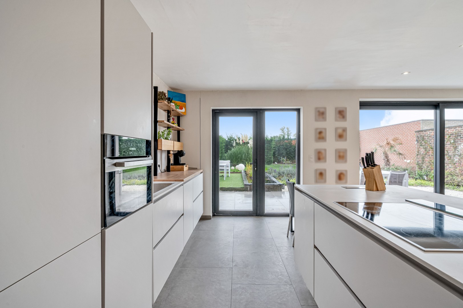 Binnenin is er een lichtrijke en ruime leefruimte, waar grote raampartijen zorgen voor een overvloed aan natuurlijk licht. De moderne keuken is uitgerust met hoogwaardige inbouwtoestellen. Er zijn vijf slaapkamers, een extra leef-of hobbyruimte en een apart bureau. Daarnaast zijn er twee badkamers, drie toiletten en een dressing. Overal werd gekozen voor kwaliteitsvolle materialen en een harmonieuze afwerking. Er zijn twee bergingen, een tuinberging en een aparte fietsenstalling. Buiten vind je een ruim zonneterras met zicht op de verzorgde tuin en de siervijver. De ligging is bovendien bijzonder gunstig: op korte afstand van de belangrijkste invalswegen en de E40. Zo combineert deze woning het beste van twee werelden — rustig wonen in een kwaliteitsvolle omgeving, met toch een uitstekende bereikbaarheid. De prijs is een indicatieprijs, alle biedingen onder, op of boven de aangegeven prijs worden in overweging genomen.