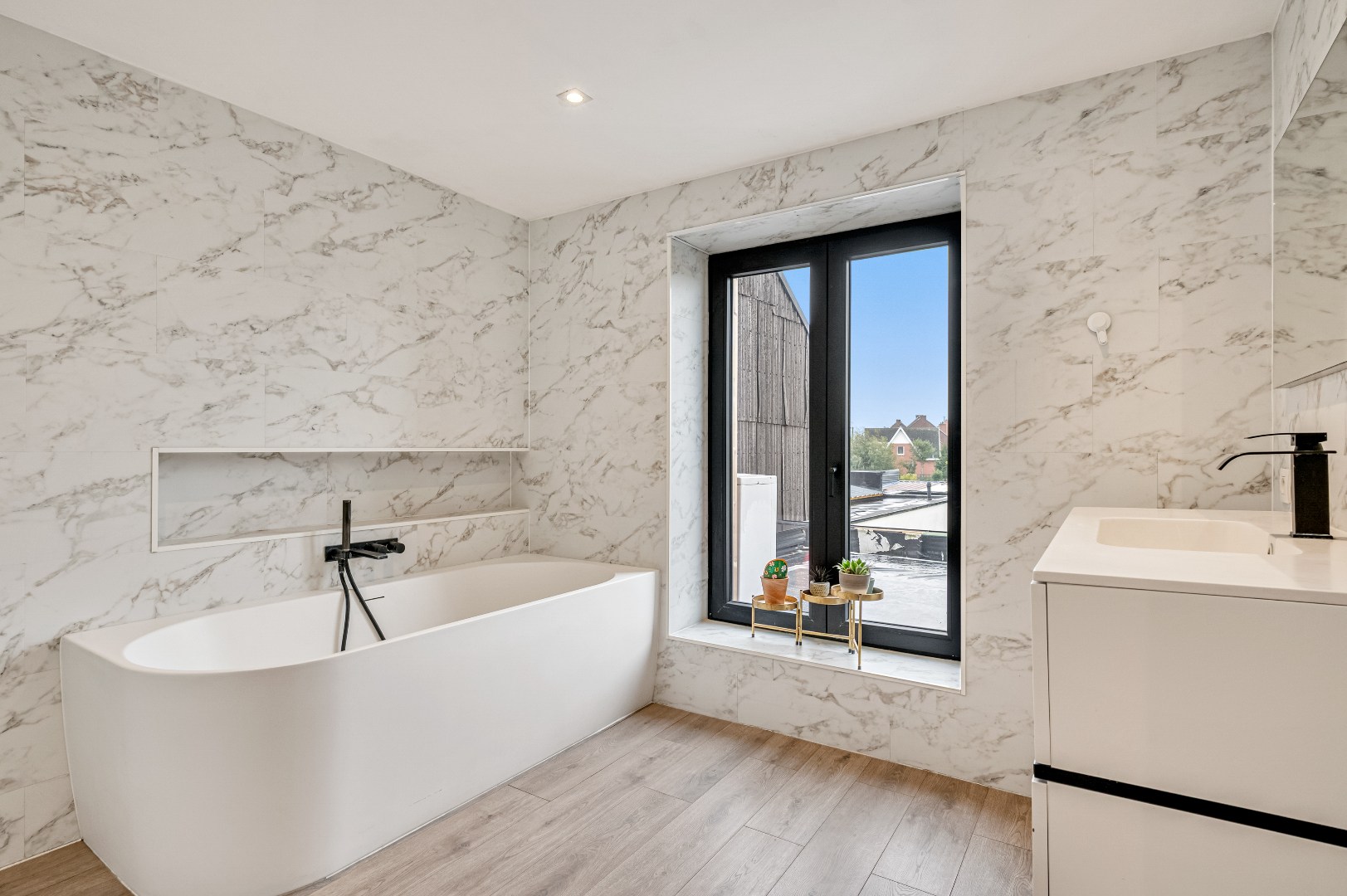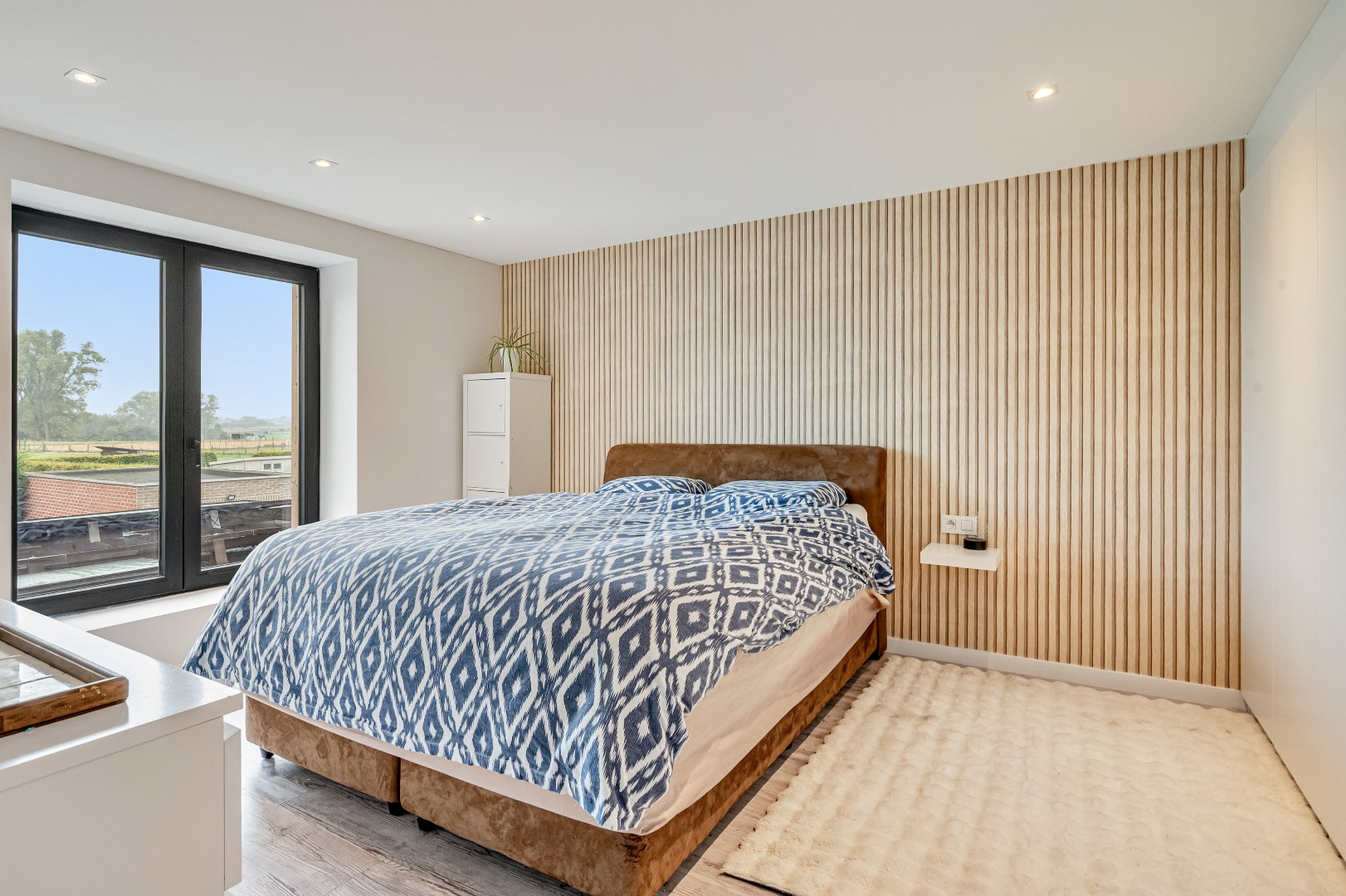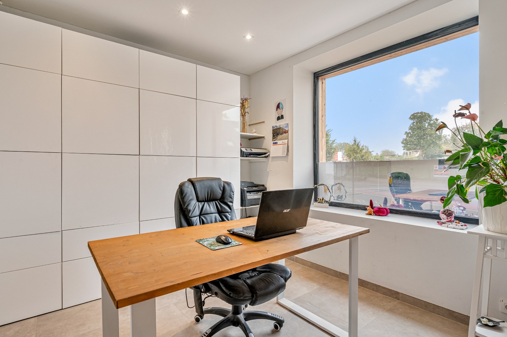 Binnenin is er een lichtrijke en ruime leefruimte, waar grote raampartijen zorgen voor een overvloed aan natuurlijk licht. De moderne keuken is uitgerust met hoogwaardige inbouwtoestellen. Er zijn vijf slaapkamers, een extra leef-of hobbyruimte en een apart bureau. Daarnaast zijn er twee badkamers, drie toiletten en een dressing. Overal werd gekozen voor kwaliteitsvolle materialen en een harmonieuze afwerking. Er zijn twee bergingen, een tuinberging en een aparte fietsenstalling. Buiten vind je een ruim zonneterras met zicht op de verzorgde tuin en de siervijver. De ligging is bovendien bijzonder gunstig: op korte afstand van de belangrijkste invalswegen en de E40. Zo combineert deze woning het beste van twee werelden — rustig wonen in een kwaliteitsvolle omgeving, met toch een uitstekende bereikbaarheid. De prijs is een indicatieprijs, alle biedingen onder, op of boven de aangegeven prijs worden in overweging genomen.